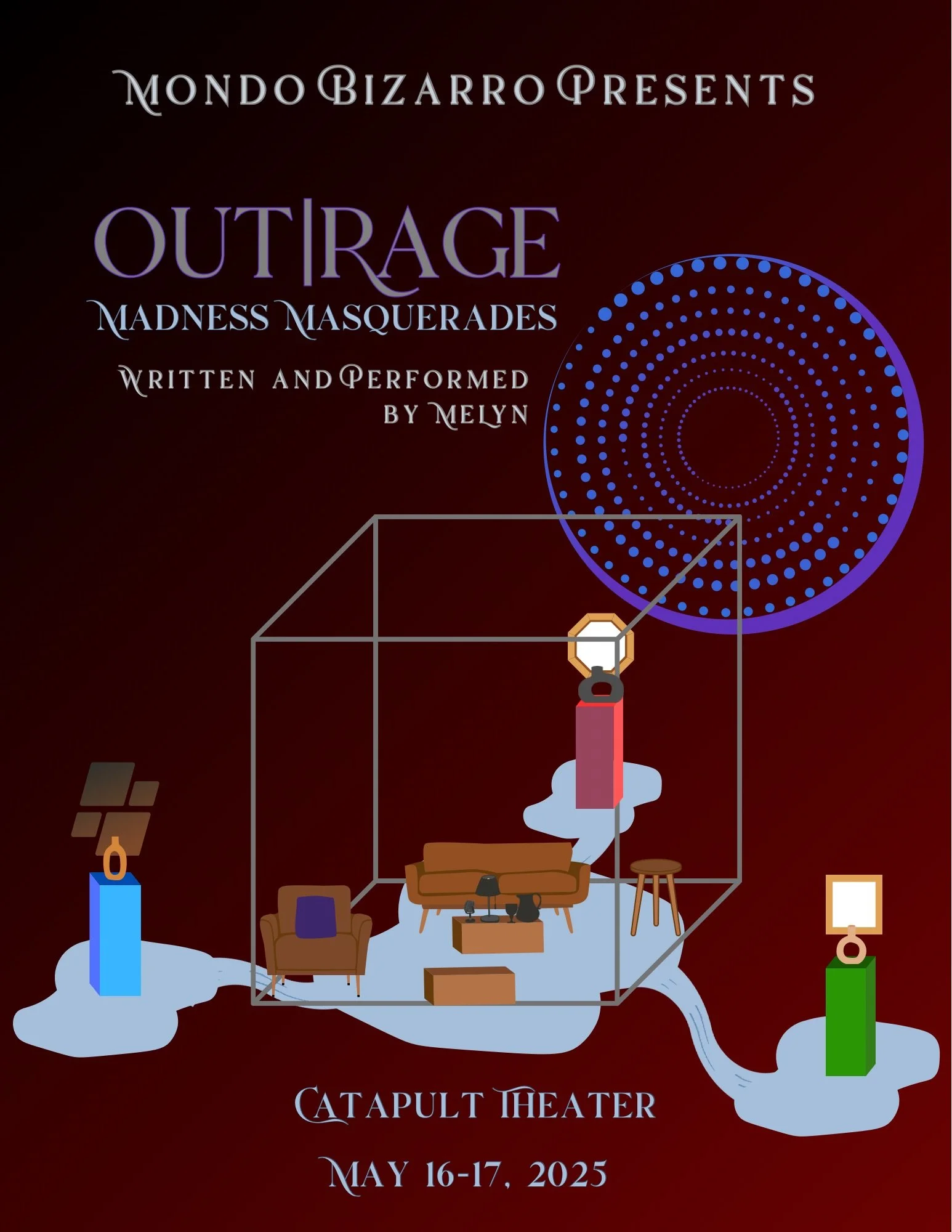Caught in the midst of your average overwhelming day, OUT | RAGE: Madness Masquerades plows headfirst into a much needed psychotic break. A 30-minute 4-Act space-time bender, OUT | RAGE follows the hard-fought balancing feat between Outer Me and Inner Me as they share a body, but only technically a brain. Through poetics, song, and dance, the Me’s struggle to make it to their next Shout - a lil 5 minutes a Freedom - without fallin’ deep into Madness’ domain. Will they elude the invitation or welcome the dizzying spins this masquerade offers?